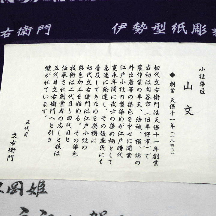 その染色技術は二代目~四代目と伝承され創業者の志と技は五代目文衛門へと引き継がれています。