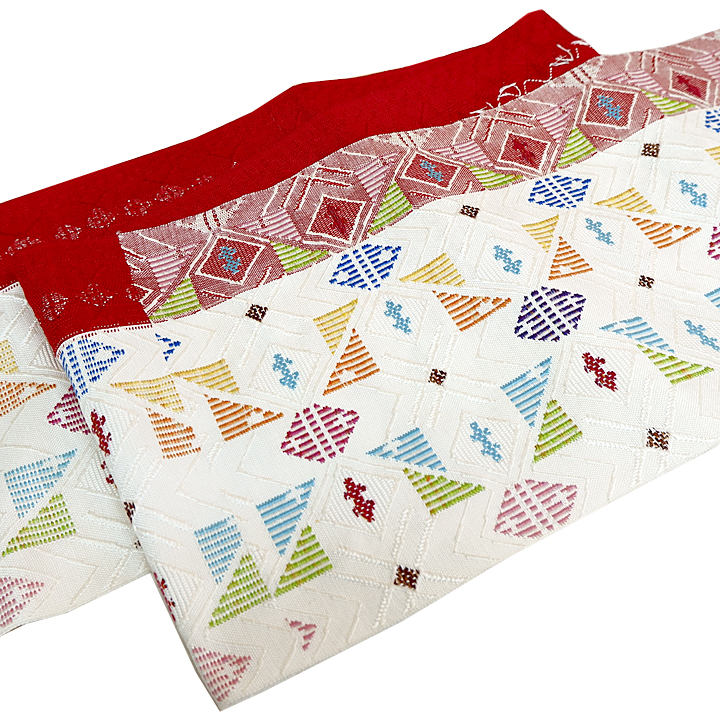 今回は鮮やかな赤と白をベースにして幾何学的なデザインが優しい色彩で表現された、目が惹かれてしまうほどの可愛らしさがあるお洒落帯になります。