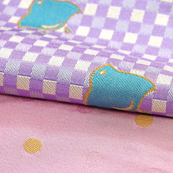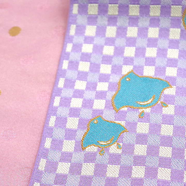 この帯の柄は「市松文様」(いちまつもんよう)と「鳥柄」の組み合わせです。市松文様は、正方形のチェック柄が繰り返し配置されたデザインで、日本の伝統的な模様の一つです。この帯では、紫と白の市松文様の上に、青い鳥のデザインが散りばめられています。市松文様はバランスと調和を表し、鳥のモチーフは自由や幸福を象徴します。この帯は全体的に明るく楽しい印象を与え、伝統的な要素と現代的なデザインが調和しています。