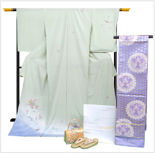 優しいグリーンと水色の色合いで描かれた爽やかな雰囲気が漂う着物コーデです。