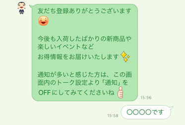 追加後、お名前とお問い合わせ内容をお送りくださいませ。(画像も可)