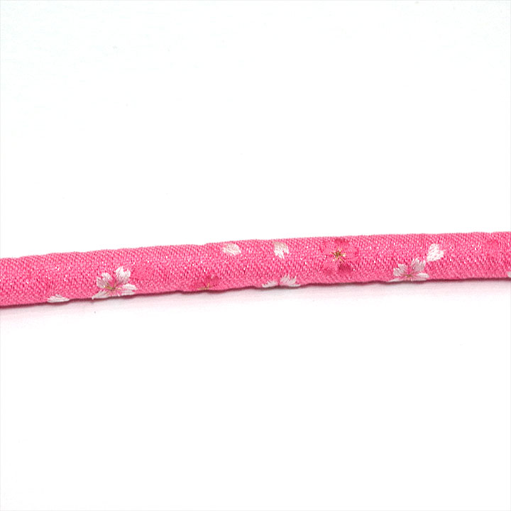 ピンク色の紐に金属糸のチラチラとした輝きと、桜の柄がそれぞれの房から約20cmと約50cm部分に配されている帯締めでございます。