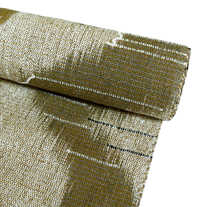 白と茶色の曲線柄に、黒や白のラインがランダムに入ったデザインの八寸帯です。手織のあたたかみが感じられるお品です。
