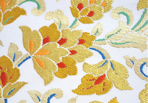 特徴的な「引箔技法」によって生み出される帯は、上品な光沢感と深い存在感を併せ持つ、まさに芸術品。